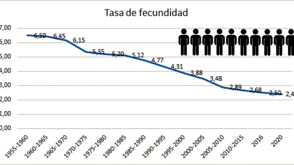 Las proyecciones están basadas en datos históricos y ciertas hipótesis sobre cómo se comportarán las variables demográficas, sin embargo, pueden aparecer imprevistos o mejorarse la calidad de los registros con los que se construyen las hipótesis. Como se verá en el gráfico siguiente, una de las variables más importantes en el cambio demográfico es la tasa global de fecundidad o promedio de hijos por mujer, que en ese periodo cayó pasando de 3,5 hijos por mujer en 2000-2005 a 2,4 hijos por mujer en 2020, es decir, casi un hijo menos por mujer.