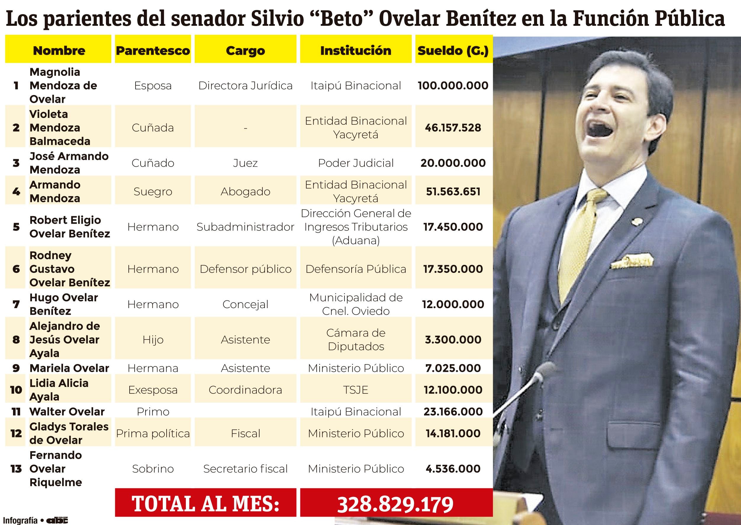 Gladys Torales de Ovelar, prima política del senador, es fiscala del Ministerio Público en el departamento de Caaguazú. La exesposa de Ovelar también está en la función pública. Se trata de Lidia Alicia Ayala, que está como coordinadora en el Tribunal Superior de Justicia Electoral (TSJE), con un salario mensual de G. 12.100.000.