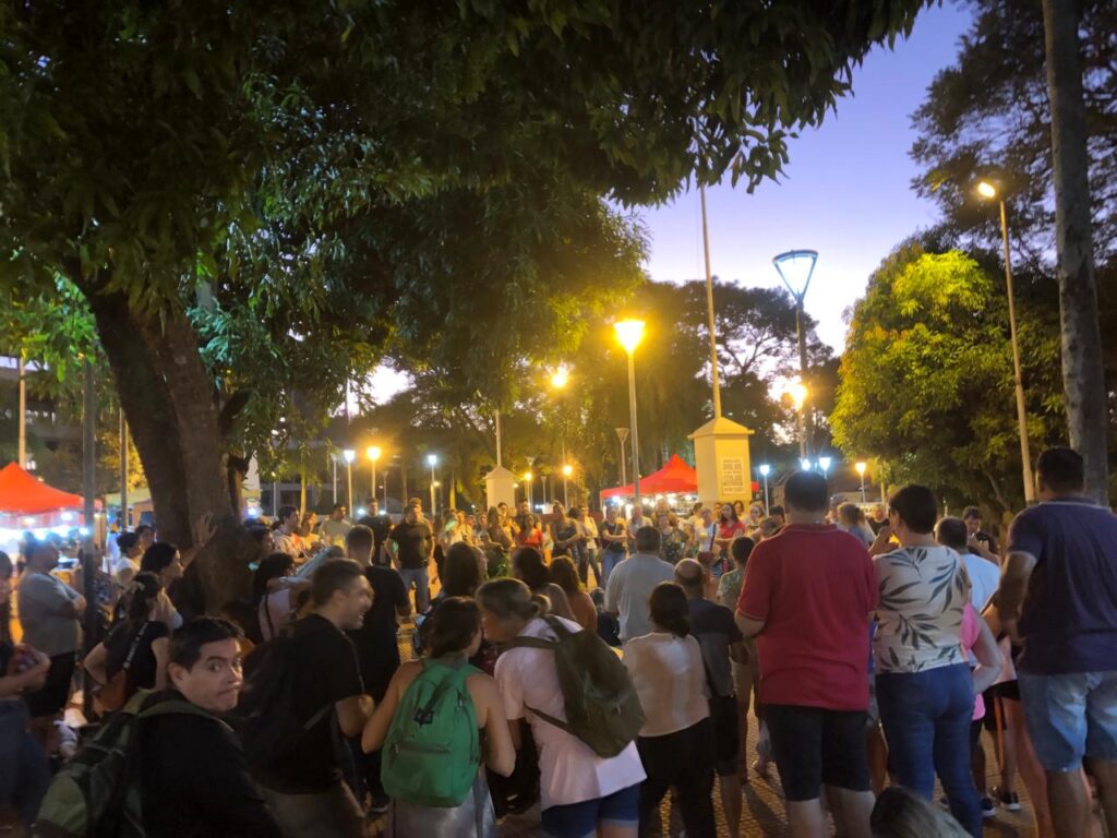 La plaza San Martin de la ciudad de Puerto Iguazú fue el punto de encuentro de aproximadamente 200 docentes que sin bandera política ni gremial se reunieron para discutir las acciones a seguir en la lucha por un salario digno. Tras la exposición de diferentes posturas optaron por continuar la asamblea el lunes en el Hito de las Tres Fronteras a las 7 de la mañana.