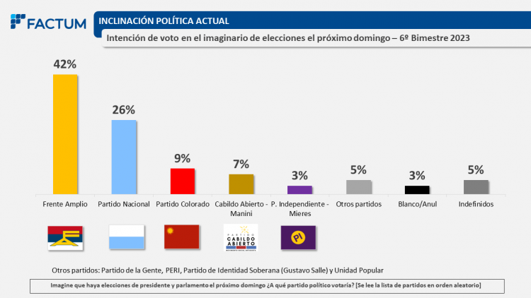 Los datos son bastantes parecidos a la encuesta cerrada el 30 de noviembre de 2023. En ese momento la intención de voto por partido mostraba al Frente Amplio con 42 por ciento, el Partido Nacional con veintiséis por ciento, Partido Colorado nueve por ciento, Cabildo Abierto siete por ciento, Partido Independiente tres por ciento, otros partidos cinco por ciento, en blanco/anulado tres por ciento, y el cinco por ciento restante es indefinido puro.