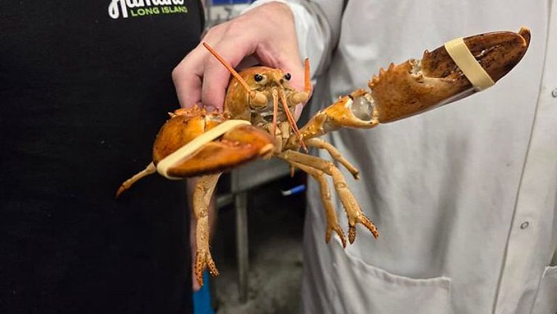 Una langosta naranja, cuya frecuencia es 1 entre 30 millones de ejemplares, fue liberada en el océano el martes tras ser rescatada de un depósito de agua en un supermercado de Nueva York (EE.UU.) por el grupo de defensa animal Humane Long Island, informa NBC News.