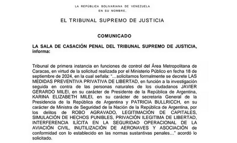 El Tribunal Supremo de Justicia de Venezuela solicitó la aplicación de medidas preventivas privativas de libertad contra altos funcionarios del gobierno argentino. En un comunicado, la Sala de Casación Penal informó que la investigación involucra al presidente Javier Milei, la secretaria general Karina Elizabeth Milei y la ministra de Seguridad, Patricia Bullrich.