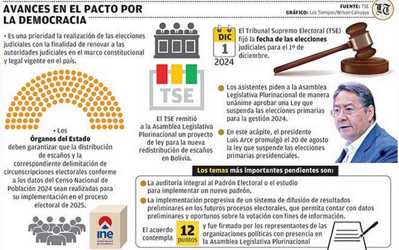 Desde el TSE mencionaron como avances del acuerdo la suspensión de las elecciones primarias; la organización de las elecciones judiciales que se llevará adelante el 1 de diciembre, el proyecto de ley con la nueva redistribución de escaños y la organización de mesas de trabajo sobre la violencia y acoso político; además, el 17 de octubre se convocará a un segundo encuentro para evaluar el acuerdo de 12 puntos, señaló el vocal Gustavo Ávila.