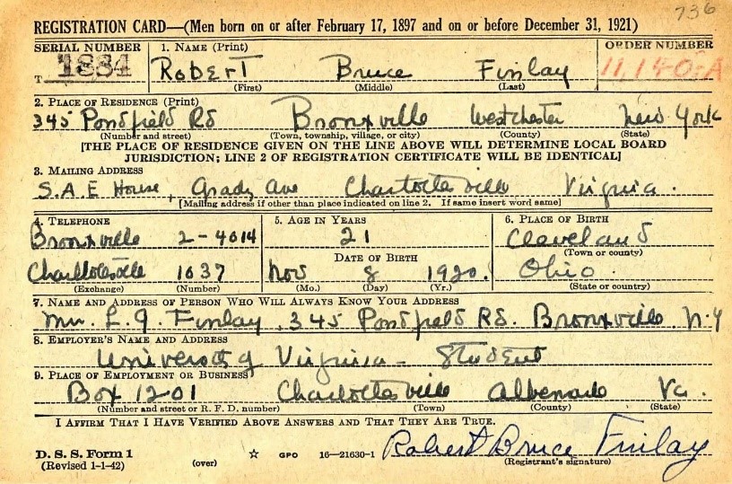 Robert Bruce Finlay abuelo materno de Taylor nació el 8 de noviembre de 1920, en 1942, Robert se inscribió para el reclutamiento. Al no ser seleccionado en la lotería, solicitó su alistamiento en la Marina de los EE. UU. en 1943, indicando que su motivo era “querer luchar“. Fue oficialmente enlistado en marzo de 1944 en la Reserva Voluntaria como Cadete de Aviación, para recibir entrenamiento de vuelo que lo convertiría en aviador naval. Su carrera militar lo llevó a diversas ubicaciones en el sur y medio oeste de EE. UU.