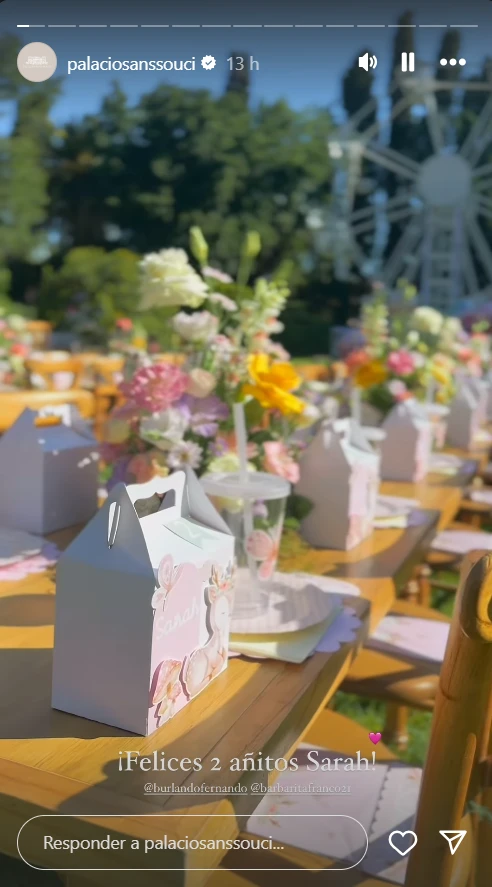 El festejo de cumpleaños de Sarah se realizó en el Palacio Sans Souci.En detalle, Sarah Burlando tuvo su increíble celebración en el coqueto y lujoso Palacio Sans Souci, bajo la organización de una importante marca de eventos. Para ello se decoró todo el parque de ese tradicional edificio de época con mini livings de madera y almohadones blancos para los más chiquitos y cómodo sillones para los mayores.