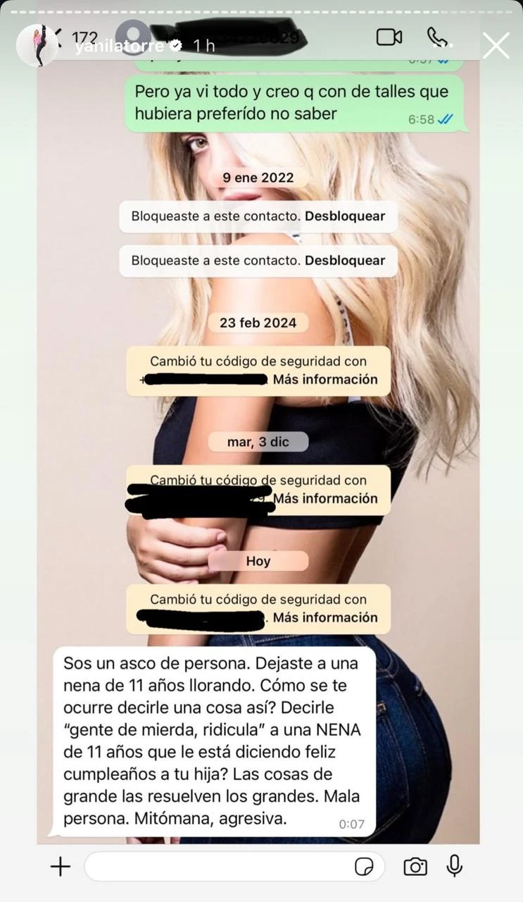 Más adelante, la ex Casi Ángeles agregó: «Decirle ‘gente de mierda, ridícula’, a una nena de 11 años que le está diciendo feliz cumpleaños a tu hija. Las cosas de grandes las resuelven los grandes. Mala persona, mitómana, agresiva«, tiró indignada, luego de una aparente llamada fallida entre las partes.