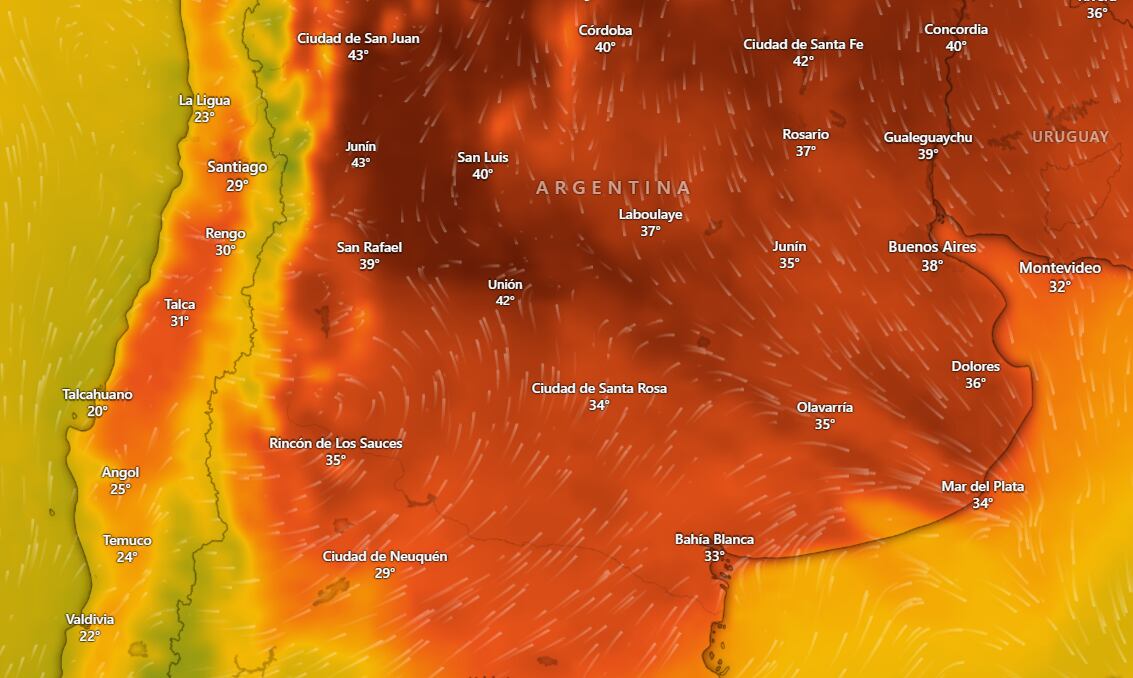 Según indicó el SMN, las zonas más afectadas -donde rige el aviso rojo- serán Neuquén (27.1°C), Mendoza (27.8°C), San Luis (31.7°C), San Juan (35°C), La Rioja (30.8°C), Catamarca (32.9°C), Tucumán (24.6°C), Santiago del Estero (29.2°C), Formosa (29.1°C), Chaco (27.9°C) y Corrientes (28.5°C). Estas condiciones implican un “efecto alto a extremo en la salud muy peligroso que puede afectar a todas las personas, incluso a las saludables”.