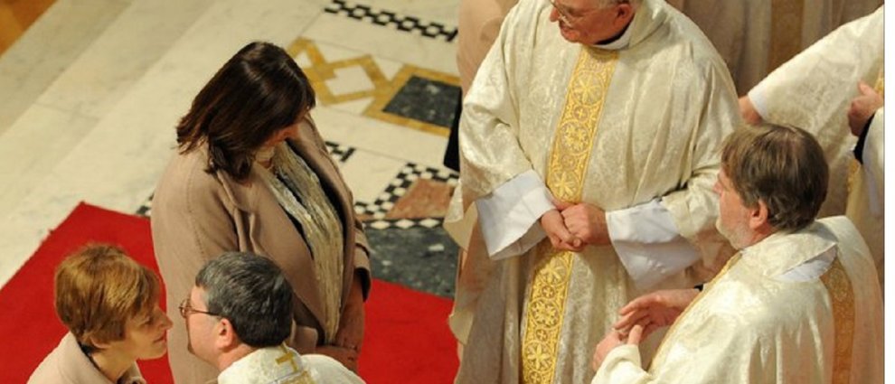 Las esposas de los tres antiguos obispos anglicanos Broadhurst, Newton y Burnham avanzan con los ropajes sacerdotales en la ordenación católica de ellos en 2011©Mazur/catholicchurch.org.uk