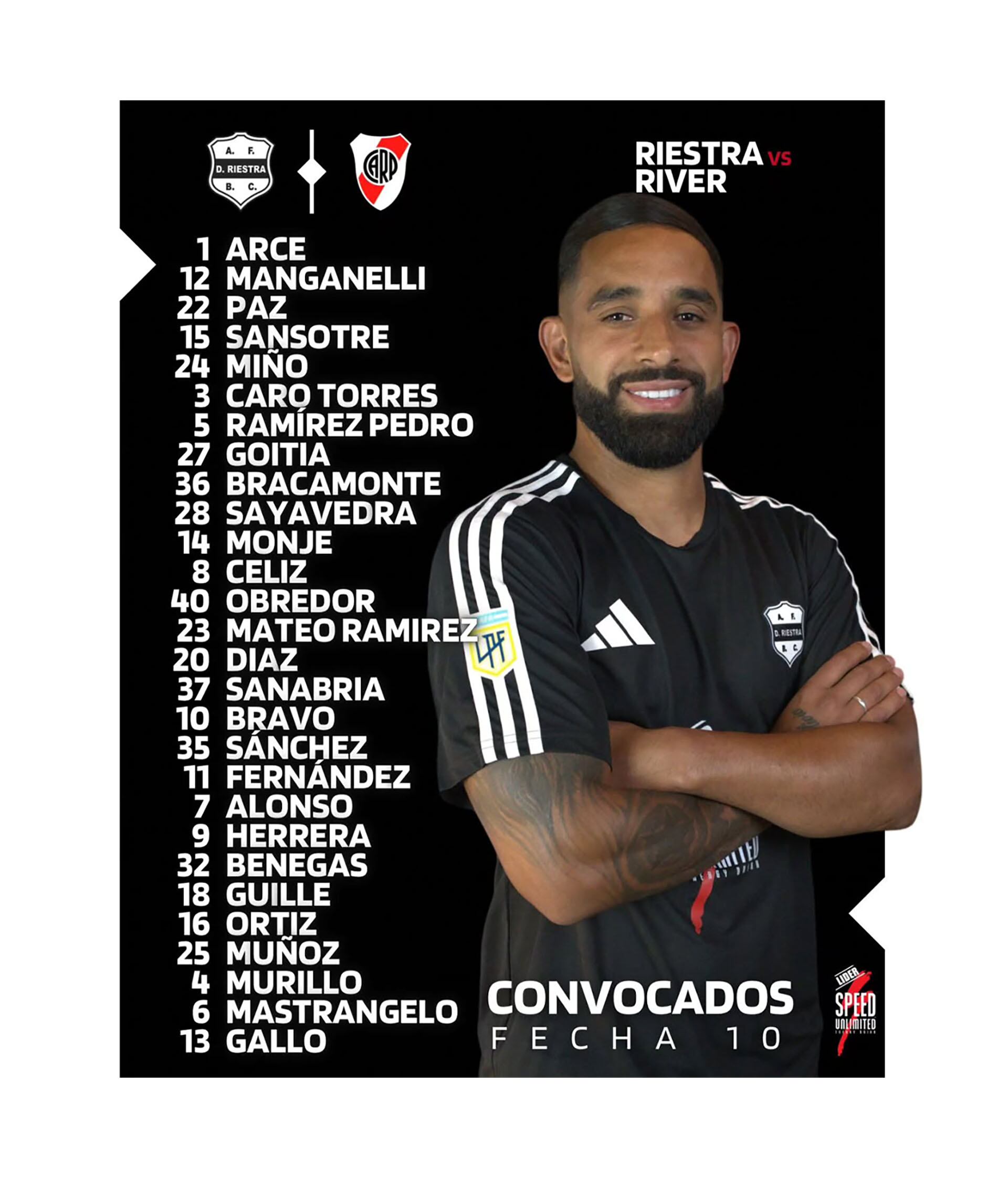 Deportivo Riestra: Ignacio Arce; Nicolás Sansotre, Facundo Miño, Nicolás Caro, Cristian Paz, Pedro Ramírez; Miltón Céliz, Jonatan Goitia, Antony Alonso; Nicolás Benegas y Jonathan Herrera. DT: Gustavo Benítez.