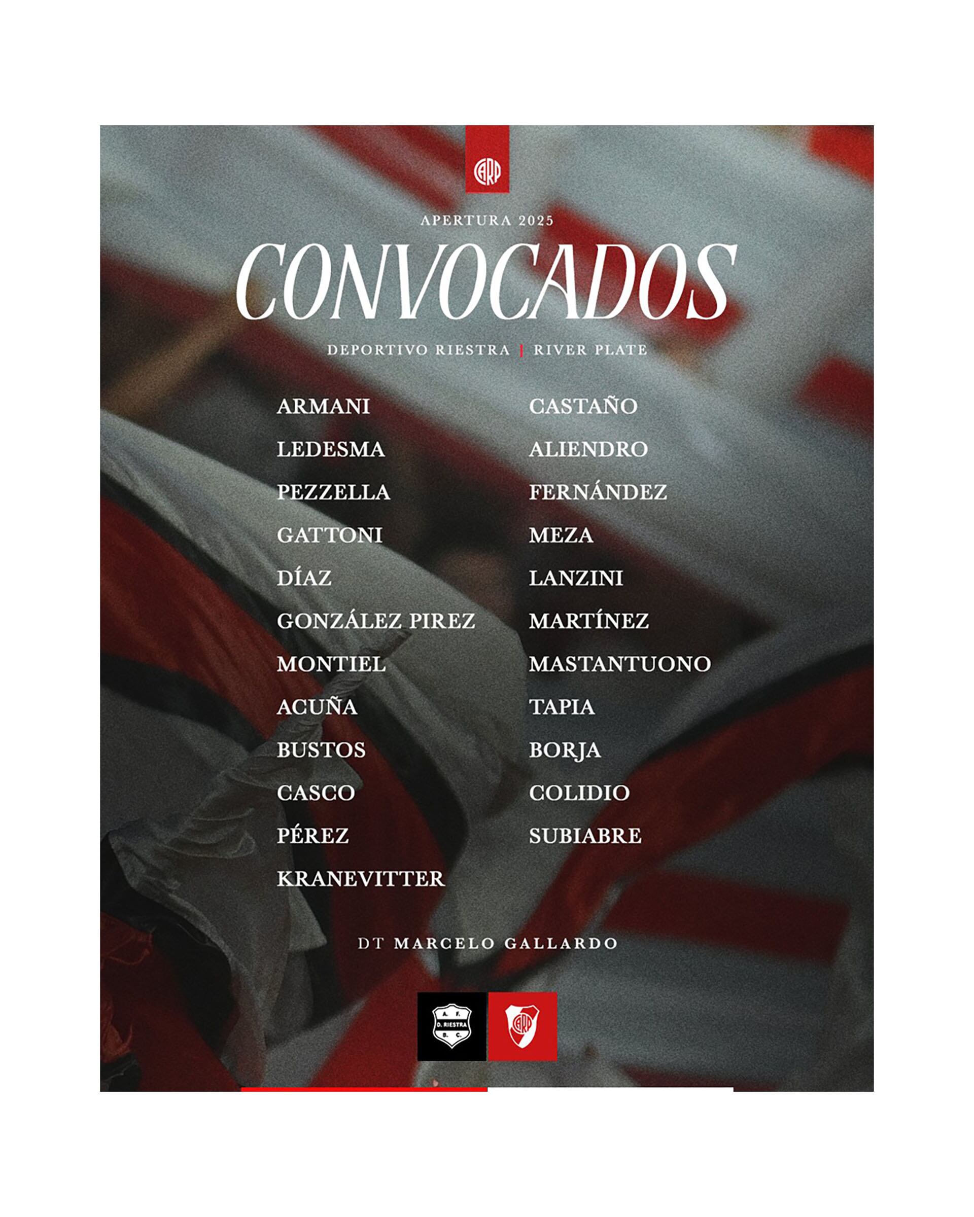River Plate: Franco Armani; Gonzalo Montiel, Germán Pezzella, Paulo Díaz, Marcos Acuña; Rodrigo Aliendro, Enzo Pérez; Maximiliano Meza, Franco Mastantuono; Facundo Colidio y Miguel Borja. DT: Marcelo Gallardo.