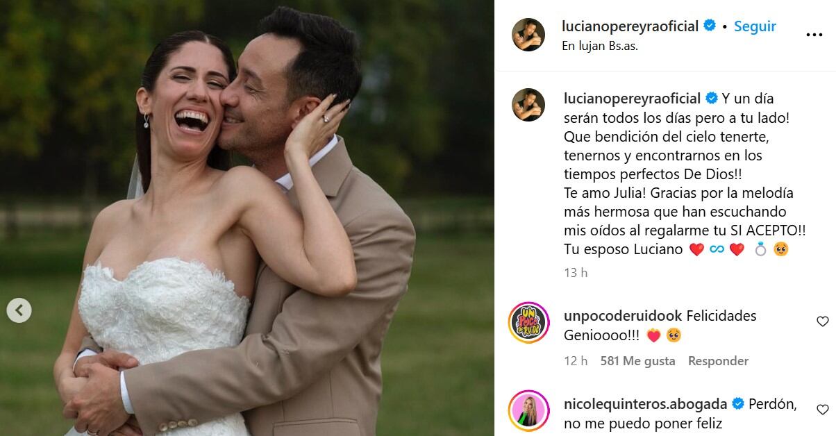 Al hacerlo oficial en sus redes sociales, Luciano Pereyra recibió una gran cantidad de mensajes en la publicación. Una de las voces que se expresó fue la de Soledad Pastorutti, colega del cantante, quien celebró el casamiento y les dejó unas palabras emocionantes.