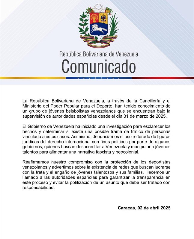 «Estarían utilizando figuras jurídicas internacionales con fines políticos para desacreditar a Venezuela y manipular a los jóvenes deportistas», expone el comunicado difundido por el ministerio de Deportes, en el que el Ejecutivo expresa su preocupación de lo que podría ser una red de trata de personas.