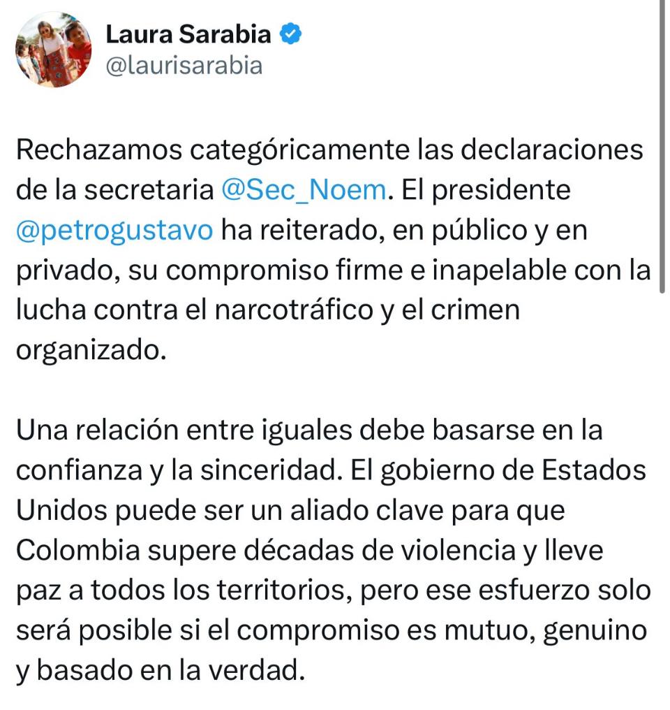 En ese contexto, resultan particularmente preocupantes las declaraciones de la secretaria Noem, que no sólo desconocen los avances de Colombia en la materia, sino que se construyen sobre afirmaciones no verificadas. El Gobierno colombiano consideró especialmente grave que se hayan emitido señalamientos contra el presidente Petro sin ninguna evidencia concreta, y recordó que la señora Noem ha sido protagonista de episodios anteriores en los que incurrió en afirmaciones altamente cuestionables. Tal fue el caso de su reciente libro, en el cual aseguró haberse reunido con el dictador norcoreano Kim Jong-un, una afirmación que fue descartada por expertos en relaciones internacionales como «dudosa», «improbable» y, en muchos casos, «falsa».