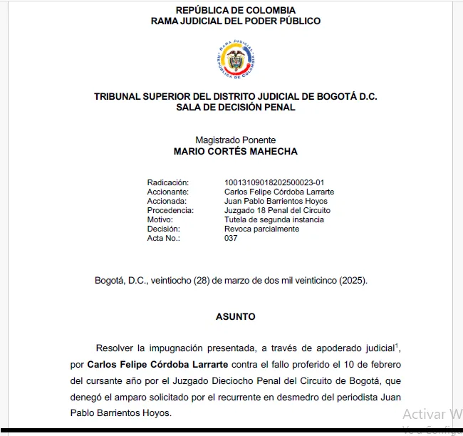 El Tribunal Superior de Bogotá emitió un fallo categórico en favor del excontralor Carlos Felipe Córdoba Larrarte, al determinar que “después de publicada la información surgen elementos de convicción que contradigan algunas de las conclusiones presentadas por el periodista, indubitablemente hace parte del derecho a la rectificación que así lo comunique el medio.” Y que, “no es factible afirmar, sin precisión alguna, que el accionante sostiene haberse beneficiado del mencionado convenio cuando éste lo está negando y, de hecho, la universidad asegura que él se matriculó como estudiante regular y que la extensión anormalmente del corta programa fue resultado de las homologaciones autorizadas por el departamento correspondiente.”