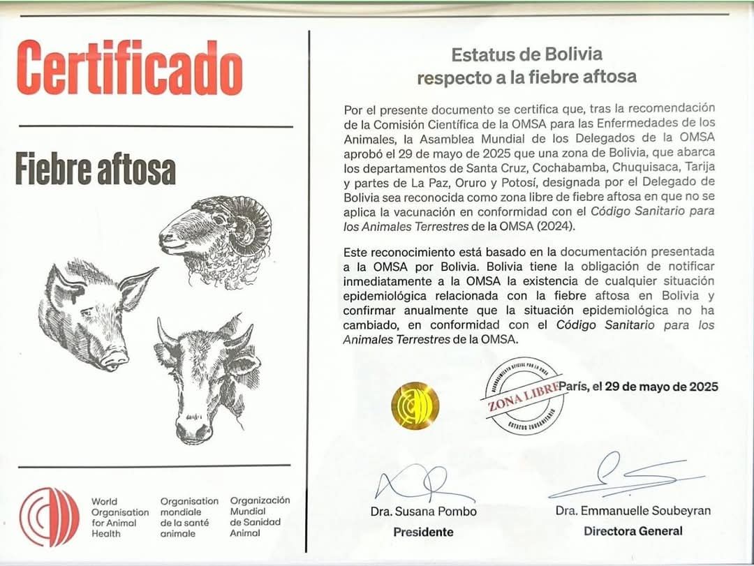 En el marco de la 92.ª Asamblea General de Delegados de la Organización Mundial de Sanidad Animal (OMSA), celebrada en París, Bolivia ha obtenido un reconocimiento trascendental: el estatus oficial de país libre de fiebre aftosa sin vacunación. Este logro representa un avance significativo para el sector ganadero nacional y fortalece la posición del país en los mercados internacionales, marcando un antes y un después en su historia sanitaria y económica.