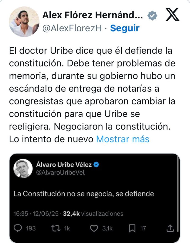 Pero también hubo voces que devolvieron el espejo a Uribe. “Lo dijo el mismo que cambió un ‘articulito’ para reelegirse”, señaló el concejal de Medellín, José Luis Marín. El representante Alfredo Mondragón fue más incisivo: “¿Quién violó la Constitución con dádivas? ¿Quién es hoy imputado por soborno y fraude procesal?”. Y el senador Alex Flórez cerró el círculo con una dosis de ironía: “Qué bueno que Uribe haya reflexionado. Si ahora defiende la Constitución, eso quiere decir que apoya la Consulta Popular”.