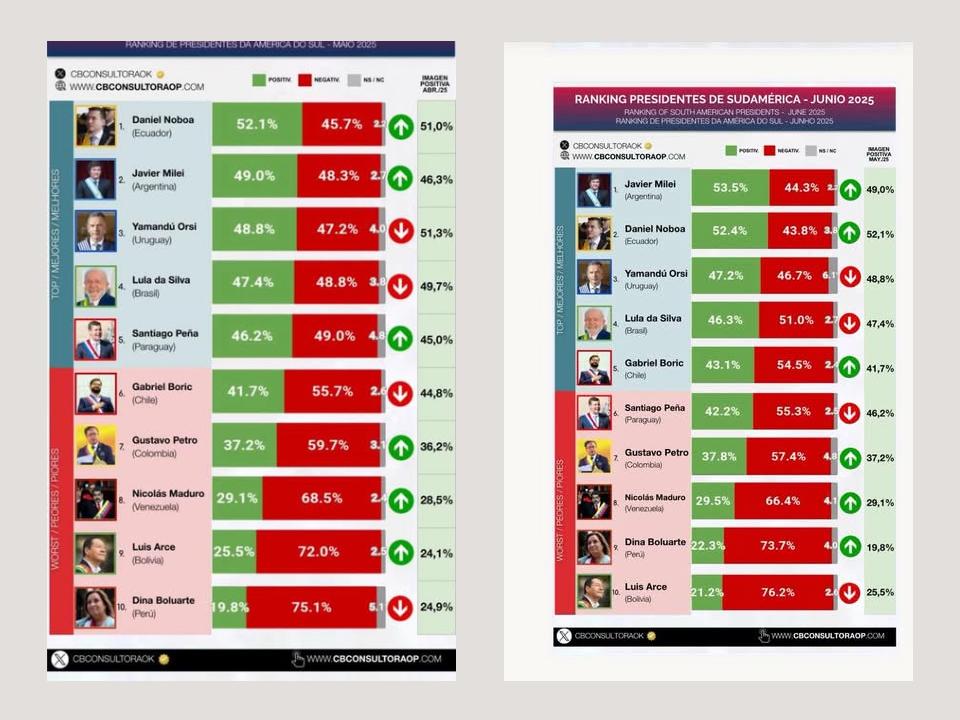 La cifra adquiere valor si se observa en contexto regional. En la medición de junio, el presidente de Argentina, Javier Milei, encabeza el ranking con un 53,5 % de imagen positiva, seguido por Daniel Noboa, de Ecuador (52,4 %), y Yamandú Orsi, de Uruguay (47,2 %). En el extremo opuesto se ubican los mandatarios con mayor desaprobación: Luis Arce, de Bolivia, con apenas 21,2 %; Dina Boluarte, de Perú, con 22,3 %; y Nicolás Maduro, de Venezuela, con un 29,5 %.
