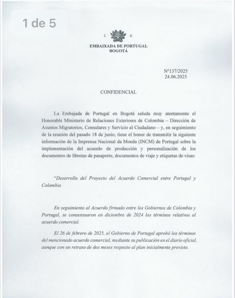 La bomba estalló con fecha exacta: 24 de junio de 2025. La Embajada de Portugal envió una comunicación confidencial al Ministerio de Relaciones Exteriores confirmando que el acuerdo estaba listo desde marzo. Incluso, detallaron que el Gobierno de Portugal había aprobado los términos en su diario oficial desde enero y que una delegación de alto nivel había viajado a Bogotá para cerrar flecos logísticos. La personalización de pasaportes -clave para la seguridad de millones de colombianos- estaba garantizada. Solo faltaba que la Cancillería pusiera la firma.