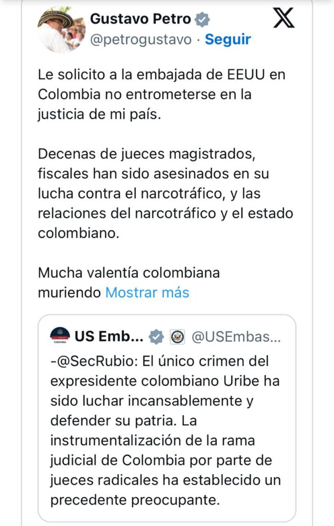 En una publicación en su cuenta oficial de X (antes Twitter), el mandatario colombiano advirtió: “Le solicito a la Embajada de EE. UU. en Colombia no entrometerse en la justicia de mi país”. La frase, cargada de firmeza institucional, no solo se interpreta como un llamado al respeto por la soberanía judicial de Colombia, sino también como una advertencia ante cualquier intento de presión diplomática o geopolítica.
