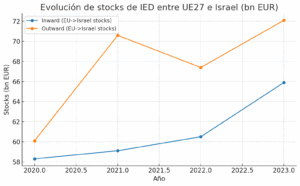 Gráfico 1: Inversiones entre UE27 e Israel (2020–2023). Fuente: Eurostat.
