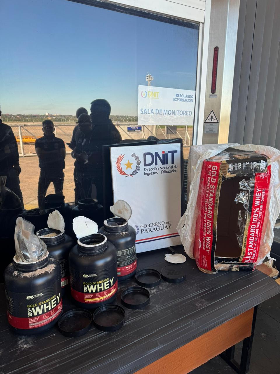 El envío, procedente de Miami, Estados Unidos, consistía en dos bultos con un peso total de 307 kilogramos. Durante el perfilamiento de riesgo realizado por el equipo de Visturía y Resguardo, se detectó una bolsa blanca que contenía una caja rotulada como “Whey Protein”, supuesto suplemento proteico en polvo.