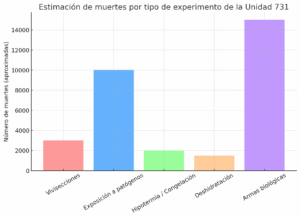 Aquí hay un gráfico de barras, mostrando estimaciones sobre las muertes causadas por la Unidad 731 y sus variados experimentos:
