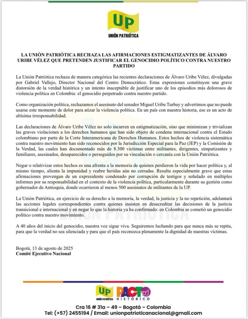 El comunicado también cuestionó el trasfondo político de quien profirió esas palabras, recordando que Álvaro Uribe ha sido señalado en múltiples informes por su presunta responsabilidad en hechos de violencia política, además de haber sido condenado por manipulación de testigos. “Que sea precisamente un expresidente el que intente relativizar este genocidio demuestra lo lejos que estamos de una verdadera reconciliación nacional”, apuntó la UP, que anunció acciones legales para defender la memoria y la dignidad de las víctimas, justo cuando se cumplen 40 años del inicio de aquel exterminio.