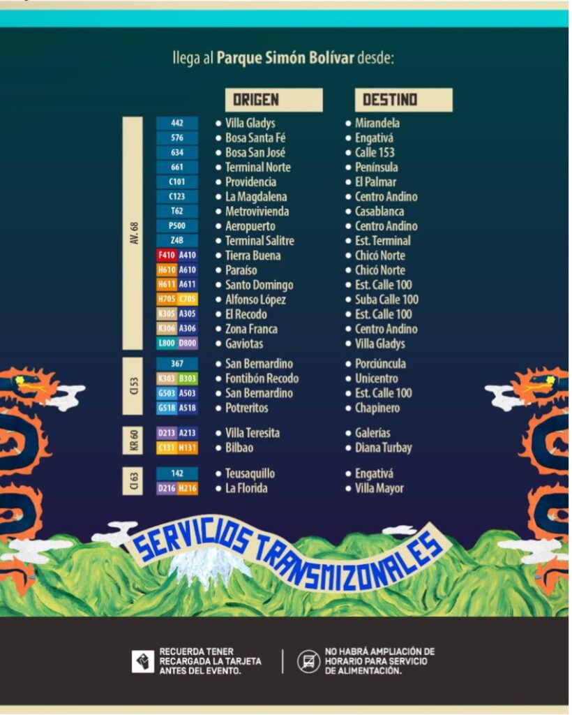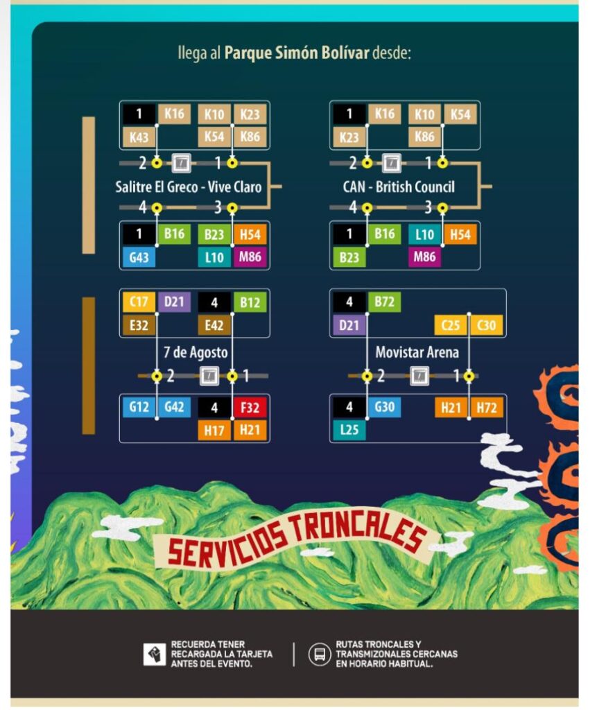 Durante el día, los asistentes también contarán con 32 rutas troncales que llegan a estaciones cercanas al Simón Bolívar, entre ellas Salitre – El Greco, CAN – British Council, 7 de Agosto y Movistar Arena. A su vez, más de 40 rutas zonales habituales tendrán paraderos en las inmediaciones del parque sobre la avenida 68, la carrera 60 y las calles 53 y 63, facilitando así el acceso y la movilidad de los miles de asistentes que llegarán desde diferentes sectores de la ciudad.