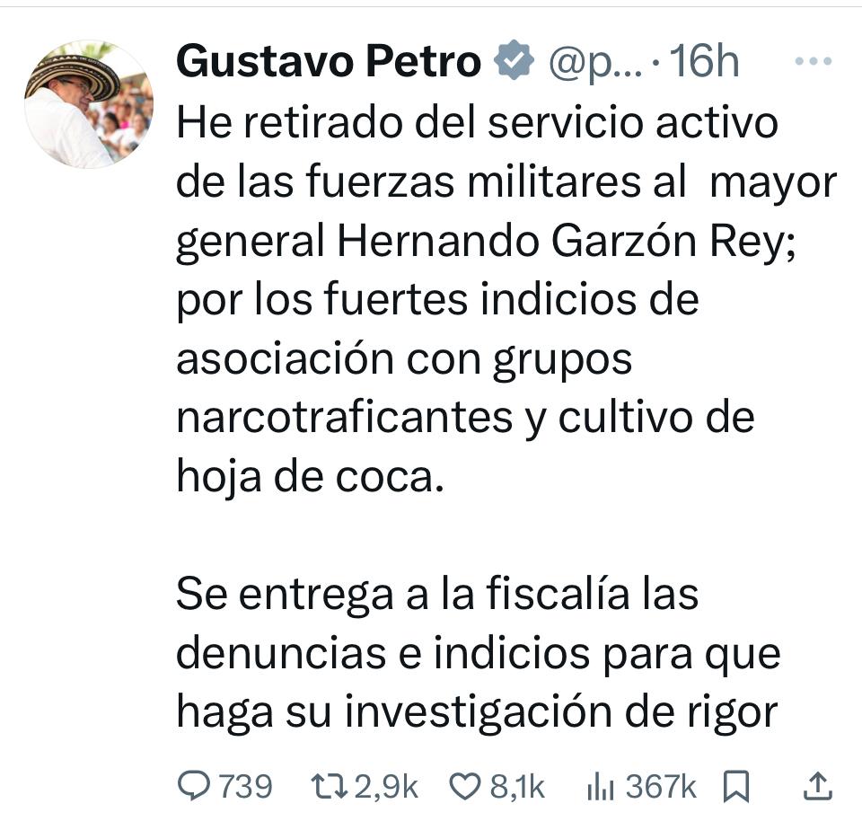 “He retirado del servicio activo de las Fuerzas Militares al mayor general Hernando Garzón Rey; por los fuertes indicios de asociación con grupos narcotraficantes y cultivo de hoja de coca. Se entrega a la Fiscalía las denuncias e indicios para que haga su investigación de rigor”, escribió el presidente Petro en su cuenta oficial.