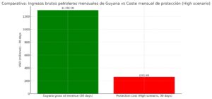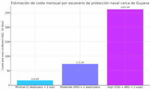 Guyana ha cambiado la situación en el Caribe. El petróleo la convierte en un punto de interés para Washington y las empresas occidentales, por lo que la presencia naval es una forma de proteger las inversiones, evitar reclamaciones territoriales y mostrar poder. Los gráficos muestran que el tipo de despliegue determina un rango de costes mensuales que va desde decenas hasta cientos de millones de dólares. La mejor política es combinar la presencia naval, la cooperación regional y el refuerzo de las instituciones en Guyana para proteger los intereses sin generar costes innecesarios.