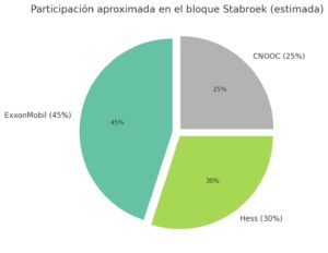* **Intereses de empresas:** Grandes empresas energéticas estadounidenses (como Exxon) tienen mucho dinero invertido en Guyana. Proteger estos activos y a su gente (o al menos asegurar que haya un ambiente estable) es algo que Estados Unidos suele hacer cuando usa su poder. La gran participación de Exxon (alrededor del 45%) y la presencia de sus socios (Hess con un 30% y CNOOC con un 25%) hacen que Guyana dependa mucho del capital estadounidense y occidental, por lo que es probable que reciba apoyo político y militar.