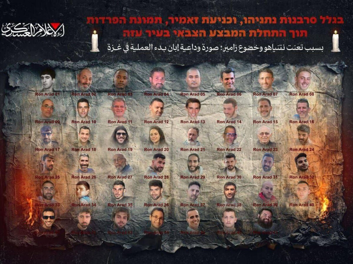 «Debido a la negativa de (el primer ministro, Benjamín) Netanyahu y (el jefe del Estado Mayor, Eyal) Zamir, una imagen de despedida mientras la operación militar en ciudad de Gaza comienza», se lee en la parte superior de la imagen difundida por los islamistas.