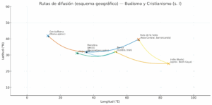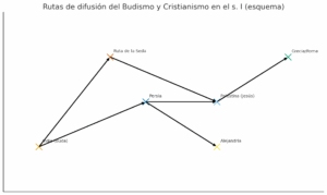 Se observa cómo el budismo podía llegar desde la India hacia Persia, la Ruta de la Seda y eventualmente el Mediterráneo, donde el cristianismo estaba naciendo en Palestina y expandiéndose hacia Alejandría, Grecia y Roma.