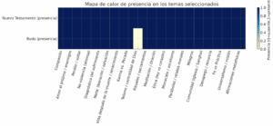 El mapa de calor muestra que casi todos los temas están presentes en ambas tradiciones, con una única diferencia binaria relevante (la centralidad de Dios). Esto visualiza por qué las métricas (Jaccard = 0.95) dieron una similitud tan alta: porque el 95% de los temas aparecen en ambas.