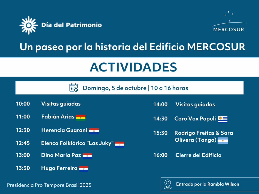 Durante estos dos días, los visitantes podrán disfrutar de un recorrido guiado por las emblemáticas instalaciones del Edificio MERCOSUR, sede de la Secretaría del MERCOSUR (SM), ubicada en el antiguo Parque Hotel. Específicamente podrán conocer el Salón de los Presidentes y el Salón de los Plenarios. También se deleitarán con diversas exposiciones y actividades culturales representativas de los Estados Partes del bloque: Argentina, Bolivia, Brasil, Paraguay y Uruguay.