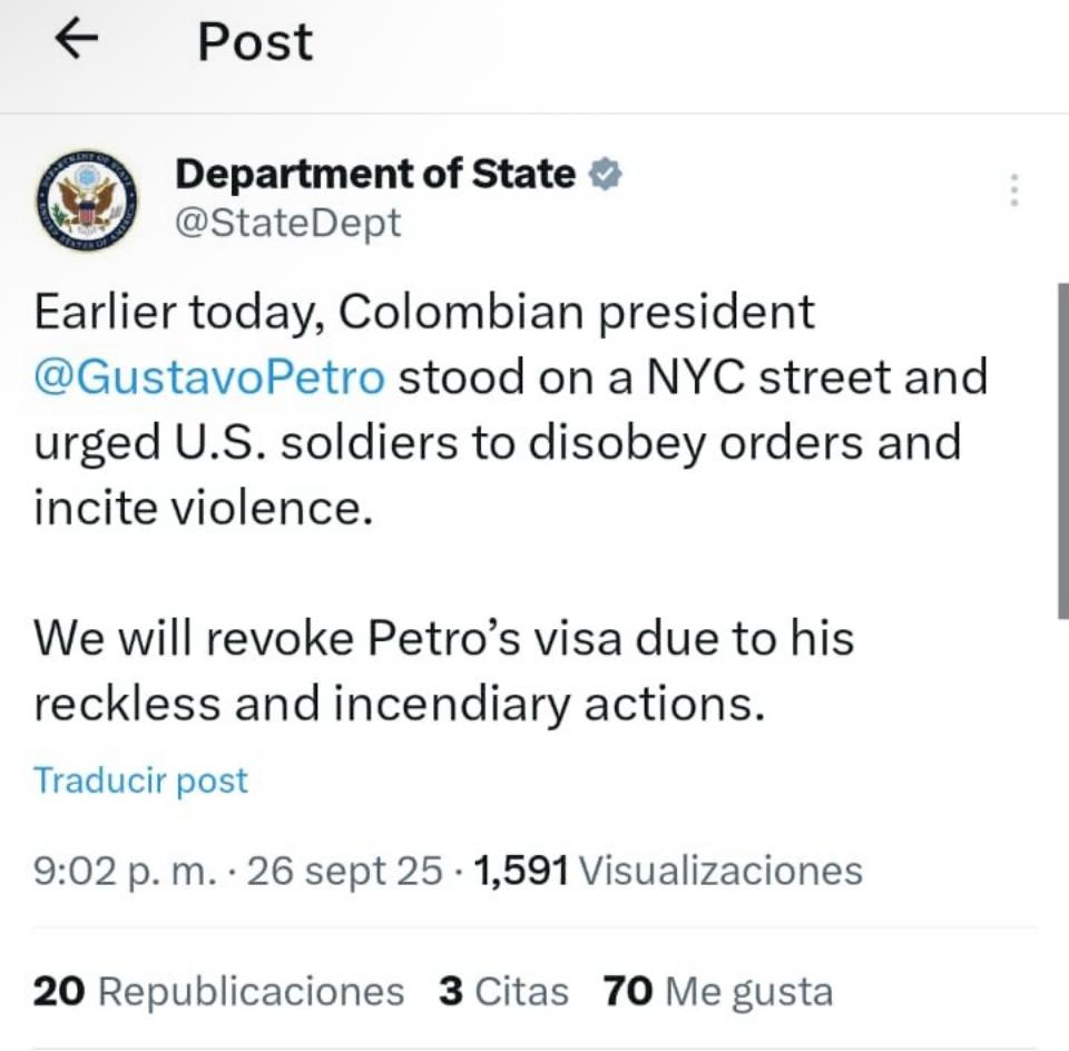 El presidente colombiano Gustavo Petro volvió a generar controversia luego de que el gobierno de Estados Unidos anunciara la revocación de su visa, una medida que se conoció a través del Departamento de Estado y que fue confirmada por la embajada norteamericana en la noche del viernes 26 de septiembre. Washington justificó la decisión señalando que, durante su reciente visita a Nueva York, Petro habría incitado a la desobediencia de las tropas estadounidenses y pronunciado discursos considerados “imprudentes e incendiarios”.