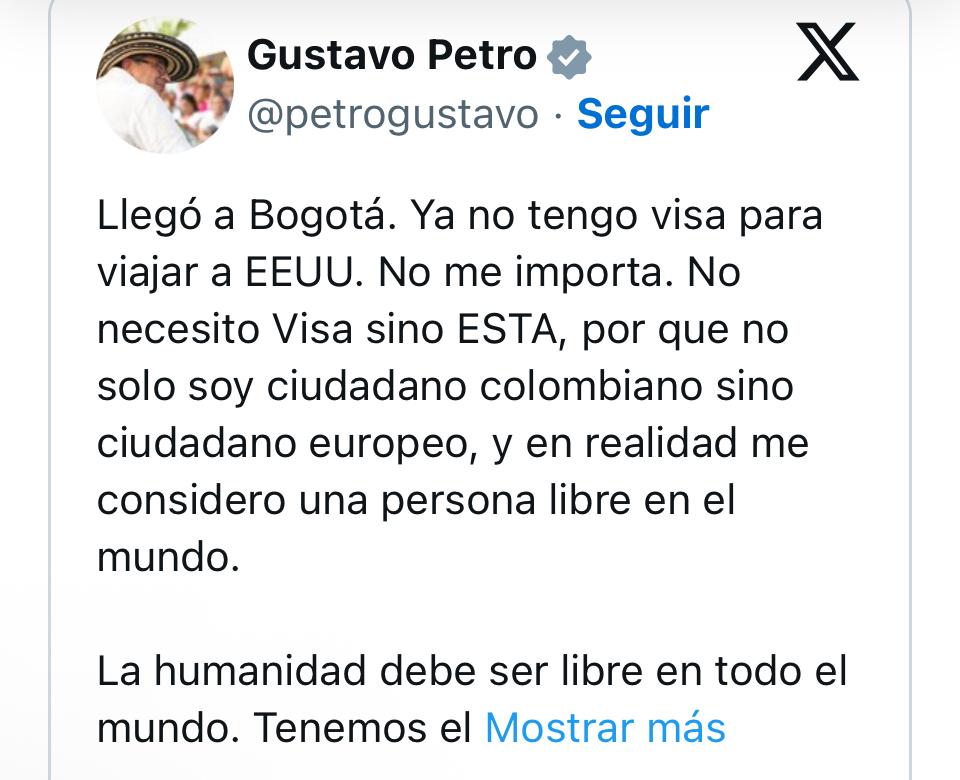 La respuesta del mandatario no se hizo esperar. En la madrugada del sábado 27 de septiembre, ya de regreso en Bogotá, Petro recurrió a su cuenta oficial en la red social X para restar importancia a lo sucedido. “Ya no tengo visa para viajar a Estados Unidos. No me importa. No necesito visa, sino ESTA, porque no solo soy ciudadano colombiano sino también europeo, y en realidad me considero una persona libre en el mundo. La humanidad debe ser libre en todo el planeta. Tenemos el derecho humano de habitar la Tierra. Soy libre y todo ser humano debe ser libre en la tierra”, escribió.