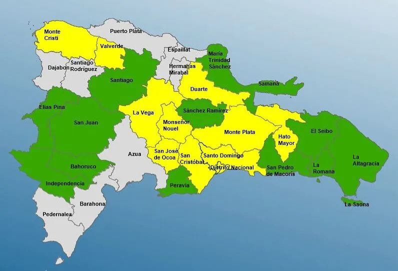 Alerta verde: Elías Piña, Independencia, El Seibo, La Vega, Samaná, La Romana, Monseñor Nouel, Santiago, La Altagracia, Dajabón, Bahoruco, Hato Mayor, San Pedro de Macorís y Duarte.