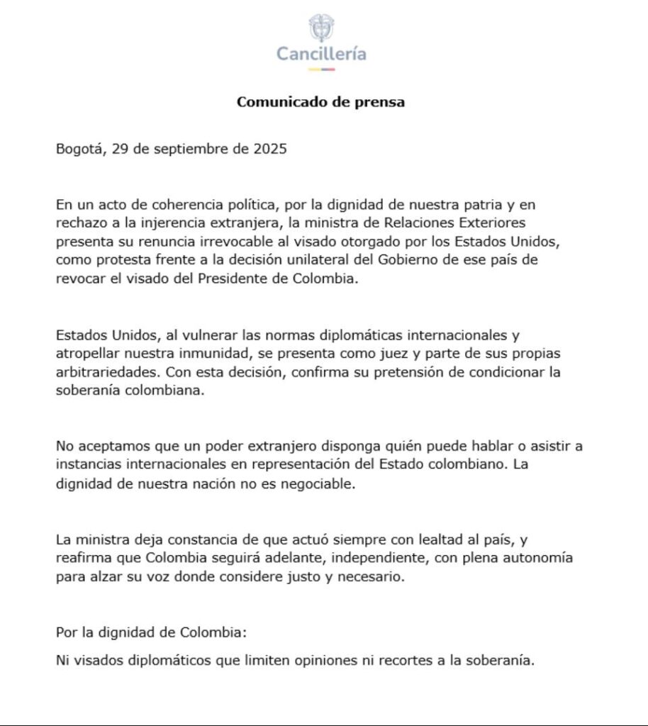 En un gesto que trasciende lo individual y se inscribe en la memoria política de nuestra nación, la ministra de Relaciones Exteriores ha presentado la renuncia irrevocable al visado otorgado por los Estados Unidos, como acto de coherencia política y de rechazo categórico a la decisión unilateral del gobierno de ese país de revocar el visado del Presidente de la República de Colombia. Esta determinación, lejos de constituir un trámite personal, representa un pronunciamiento firme en defensa de la soberanía nacional y de la dignidad de un pueblo que no admite condiciones impuestas desde el exterior.