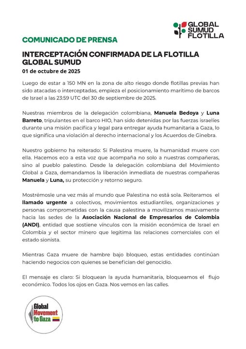 Si la información resulta confirmada, el mundo presencia un nuevo crimen internacional atribuido al gobierno de Benjamín Netanyahu. Según una versión que llegó directamente al presidente de Colombia, Gustavo Petro, en aguas internacionales habrían sido detenidas dos ciudadanas colombianas mientras desarrollaban actividades de solidaridad humanitaria con el pueblo palestino. El hecho, de por sí grave, coloca a Colombia en una encrucijada diplomática y ética que no admite silencios ni evasivas.