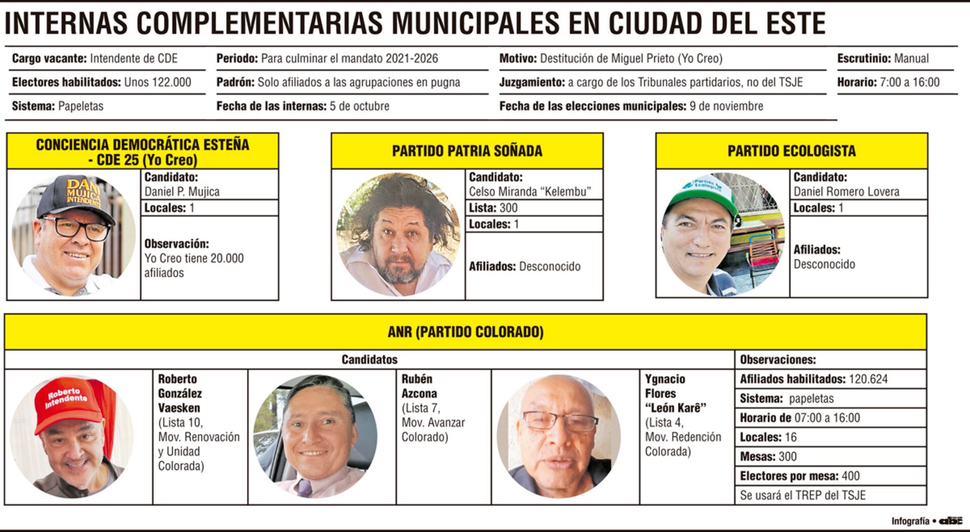 Más de 122.000 personas están habilitadas para votar, mayormente afiliadas al Partido Colorado, que postula a tres candidatos, Roberto González Vaesken, Rubén Azcona y León Guaraní, y tiene 16 locales de votación, mientras que los otros partidos cuentan con un solo local. Daniel Mujica es el único candidato opositor, apoyado por el Partido Liberal Radical Auténtico.
