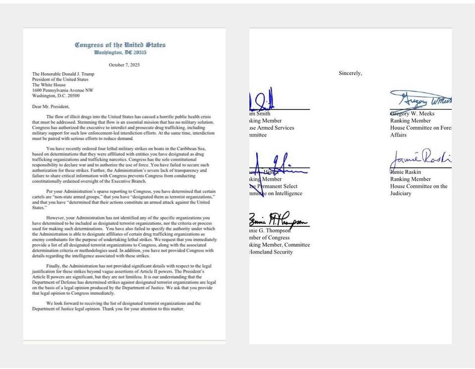 La misiva, firmada por los representantes Gregory Meeks, Jamie Raskin, Adam Smith, James Himes y Bennie Thompson, reclama al mandatario que entregue la lista completa de las organizaciones a las que supuestamente pertenecían las lanchas atacadas. Los congresistas argumentan que la Casa Blanca ha actuado sin la debida autorización del Congreso y sin ofrecer una explicación clara sobre la base jurídica que respalda dichas operaciones.