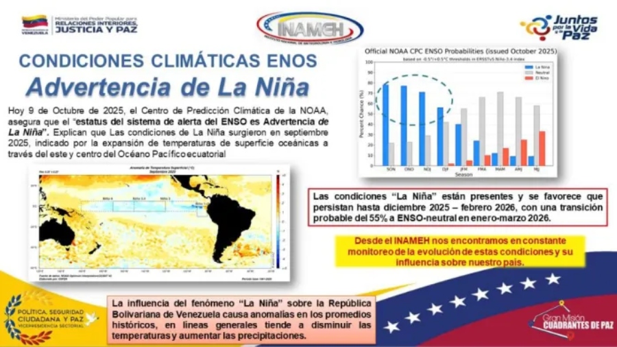 El Instituto Nacional de Meteorología e Hidrología (Inameh) informó que existen señales climatológicas en el país que evidencian la presencia de «La Niña» en Venezuela, asegurando que estas podrán quedarse hasta febrero de 2026.