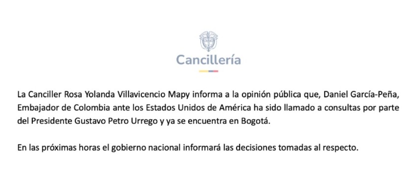 La ministra de Relaciones Exteriores, Rosa Yolanda Villavicencio Mapy, informó que el embajador de Colombia ante los Estados Unidos, Daniel García-Peña, fue llamado a consultas por el presidente Gustavo Petro Urrego y ya se encuentra en Bogotá.