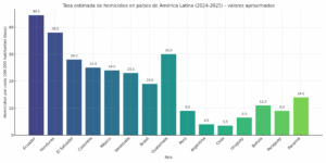 En promedio, la tasa regional oscila cerca de 17 homicidios por cada 100.000 habitantes, contrastando con la media mundial de 6.