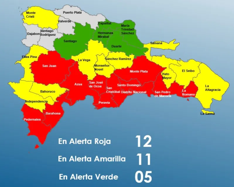 En tanto que el Distrito Nacional y 13 provincias siguen en verde, porque podrían ocurrir lluvias y ráfagas de viento. En esta condición están: San José de Ocoa, Samaná, Dajabón, Azua, Monte Plata, Elías Piña, Distrito Nacional, San Cristóbal, San Juan, Peravia, Monseñor Nouel, Santo Domingo y La Altagracia.