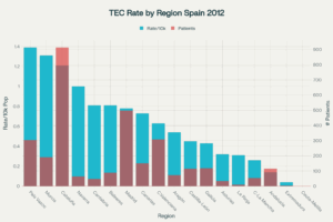 Gráfica tridimensional de las Regiones Españolas sobre el uso de TEC y Pacientes Atendidos en España durante 2012