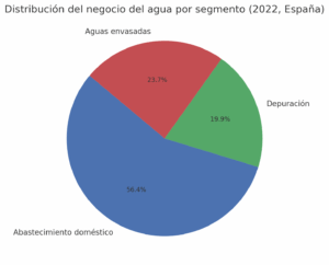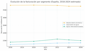 Aunque los datos pormenorizados de cada año no siempre son fáciles de encontrar públicamente, se observa un crecimiento leve en el abastecimiento doméstico (un mercado maduro, con consumo estable), mientras que los segmentos de depuración, reutilización, desalación, y agua embotellada muestran más movimiento.