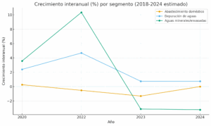 Respecto al crecimiento interanual (%) por segmento se observa que la depuración goza de un aumento consistente, las aguas envasadas manifiestan una volatilidad perceptible, y el abastecimiento doméstico exhibe un avance esencialmente estancado.