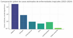 Gráfico de barras (escala logarítmica) compara casos: malaria (263 millones, 2023, OMS) frente al dengue (≈7. 6 millones, 2024, OMS) y otros arbovirus (estimaciones). Estas cifras demuestran la gran diferencia entre malaria y arbovirosis según el total de casos.